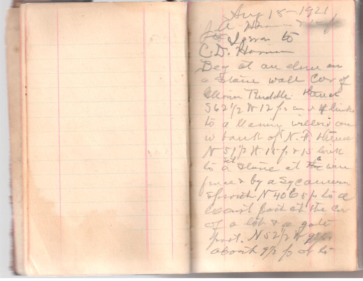 D. A. Landes writes in the inside cover of his 1921 surveying ledger about his mother, Christina: